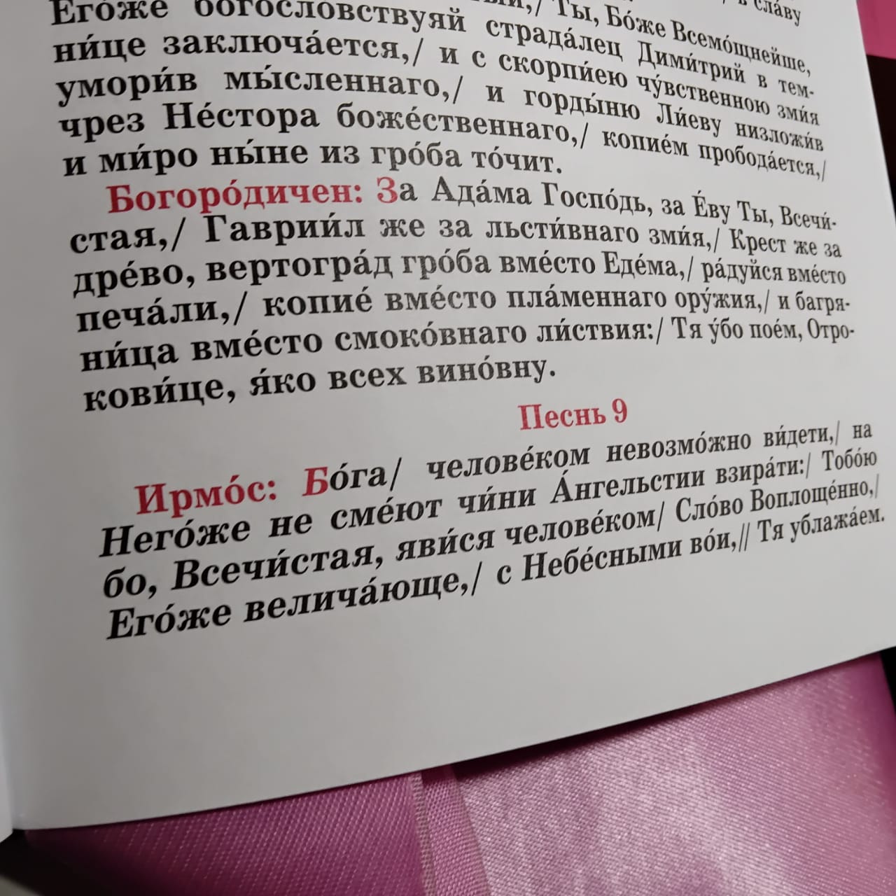 Вели́ка обре́те в беда́х/ тя побо́рника вселе́нная, страстоте́рпче,/ язы́ки побежда́юща./ Я́коже у́бо Ли́еву низложи́л еси горды́ню,/ и на по́двиг дерзнове́нна сотвори́в Не́стора,/ та́ко, свя́те Дими́трие,/ Христу́ Бо́гу моли́ся// дарова́ти нам ве́лию ми́лость.