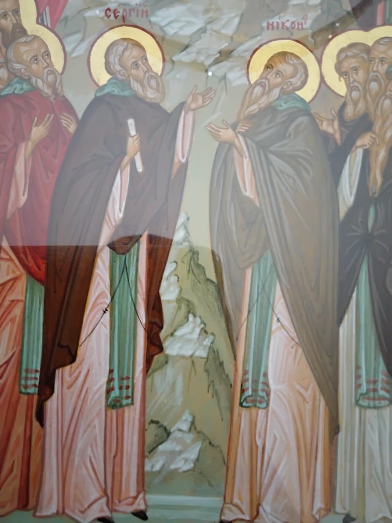 Перевод: В пощении став подобными Великому Антонию и подражав в подвигах Евфимию Иерусалимскому, вы были как ангелы на земле, всегда просвещая, преподобные, сердца верующих Божественными знамениями и чудесами. Потому с радостью вас почитаем и с любовью к вам взываем: «Радуйтесь, преподобные отцы Сергий и Никон, постников украшение и всей Российской земли великая сила».