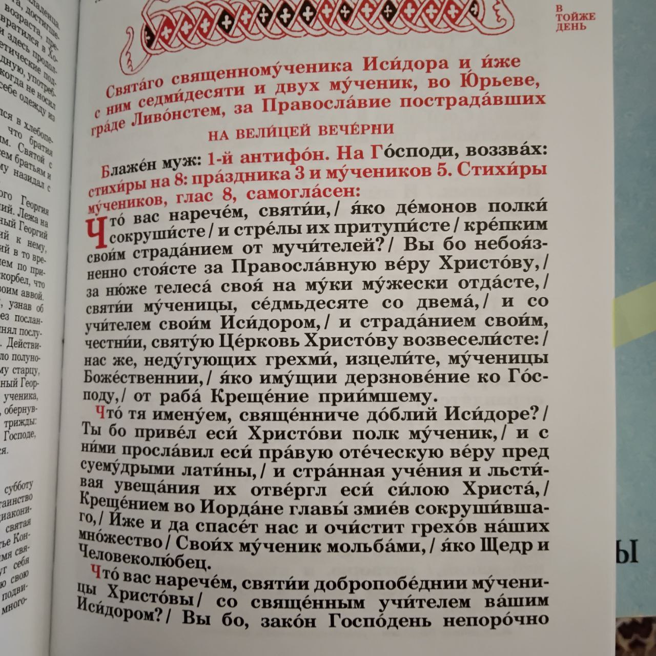 Перевод: Собрание мучеников Христовых в молитвенных песнопениях почтим, пострадавших мужественно ради истинной веры Христовой и вражескую гордыню окончательно низложивших. Озарившись благодатью Несозданной Троицы, прославляемые, со священномучеником Исидором пострадавшие, как звезды, сияете вы во всем мире, и молитесь сейчас Христу непрестанно, и нас защищаете от нападения вражеских народов, постоянные молитвенники о душах наших.
