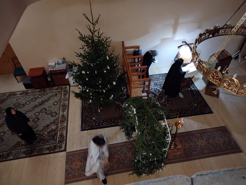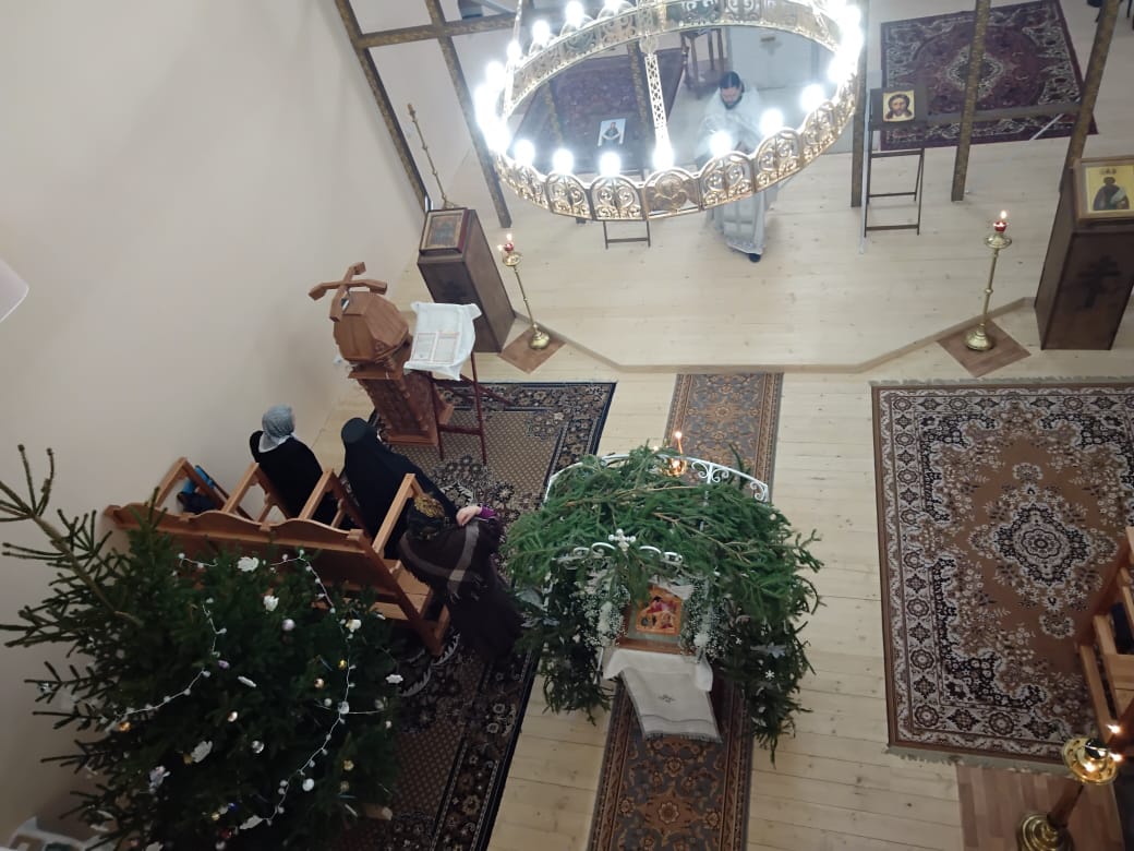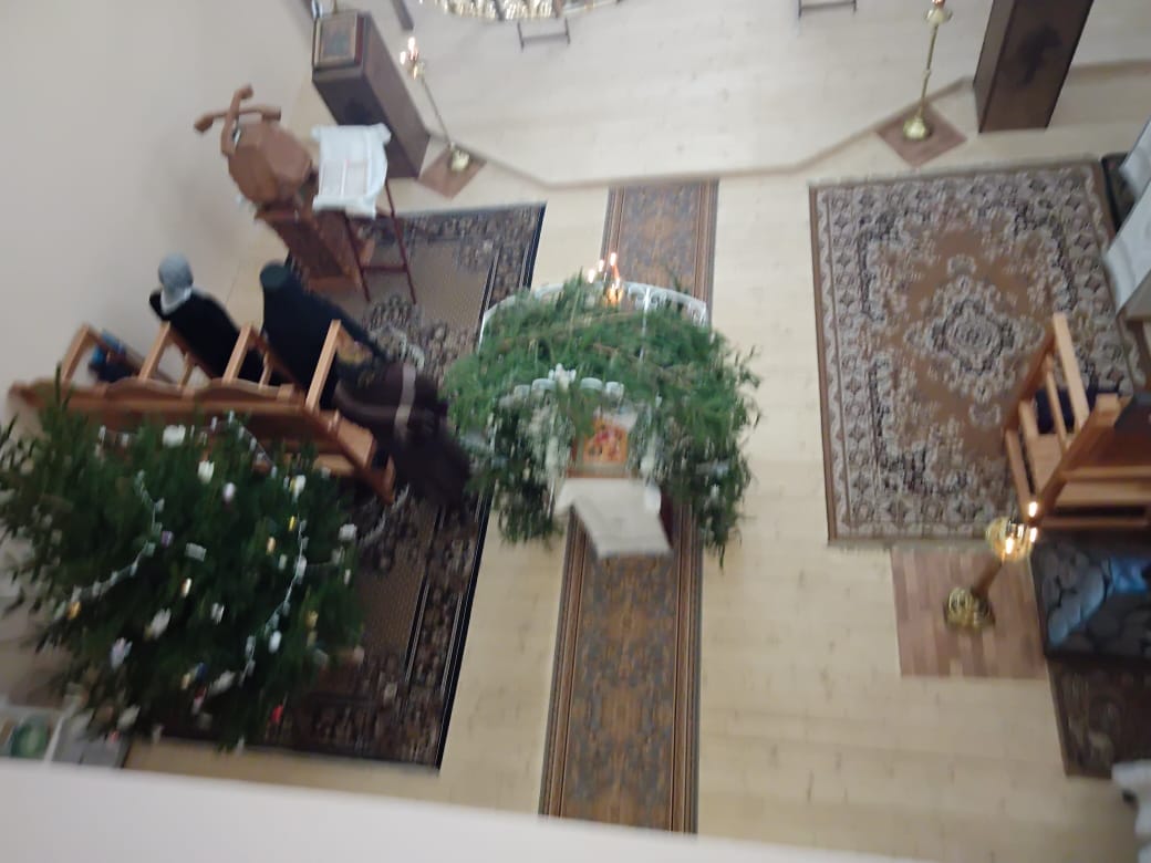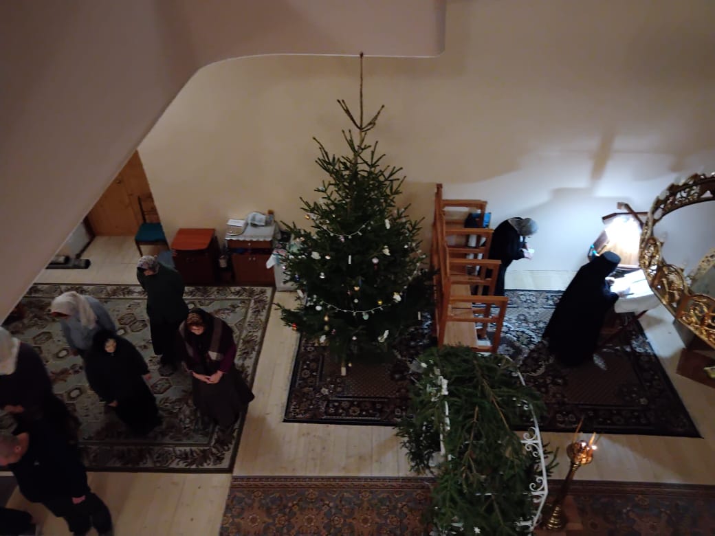 Написова́шеся иногда́ со ста́рцем Ио́сифом,/ я́ко от се́мене Дави́дова, в Вифлее́ме Мариа́м,/ чревонося́щи безсе́менное Рожде́ние./ Наста́ же вре́мя рождества́,/ и ме́сто ни еди́ноже бе обита́лищу,/ но, я́коже кра́сная пала́та,/ верте́п Цари́це показа́шеся.// Христо́с ражда́ется пре́жде па́дший воскреси́ти о́браз.