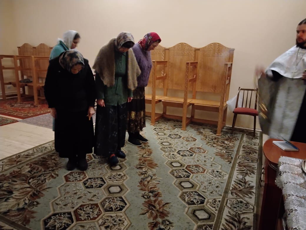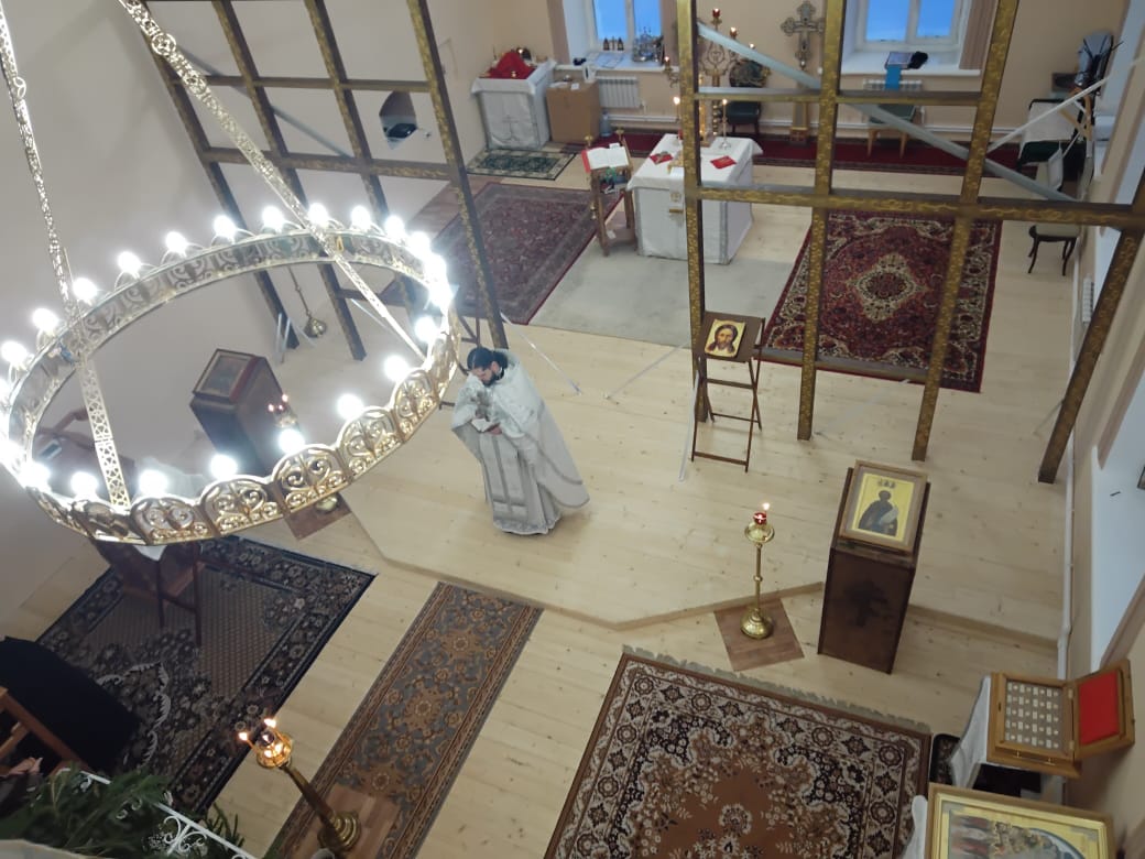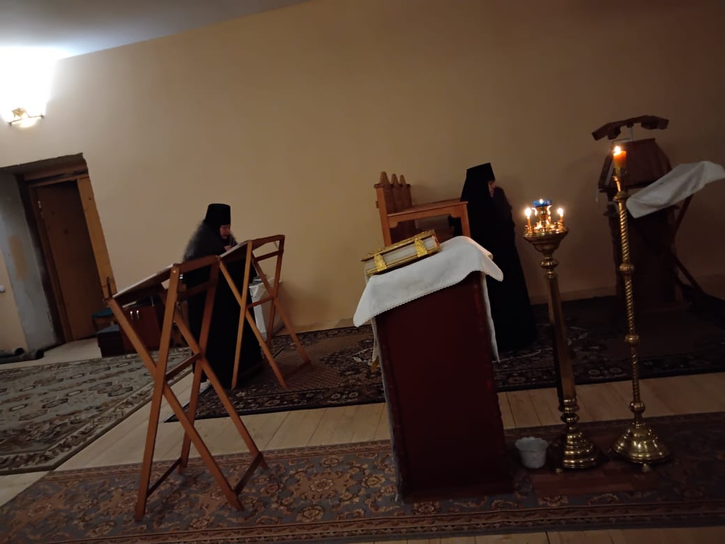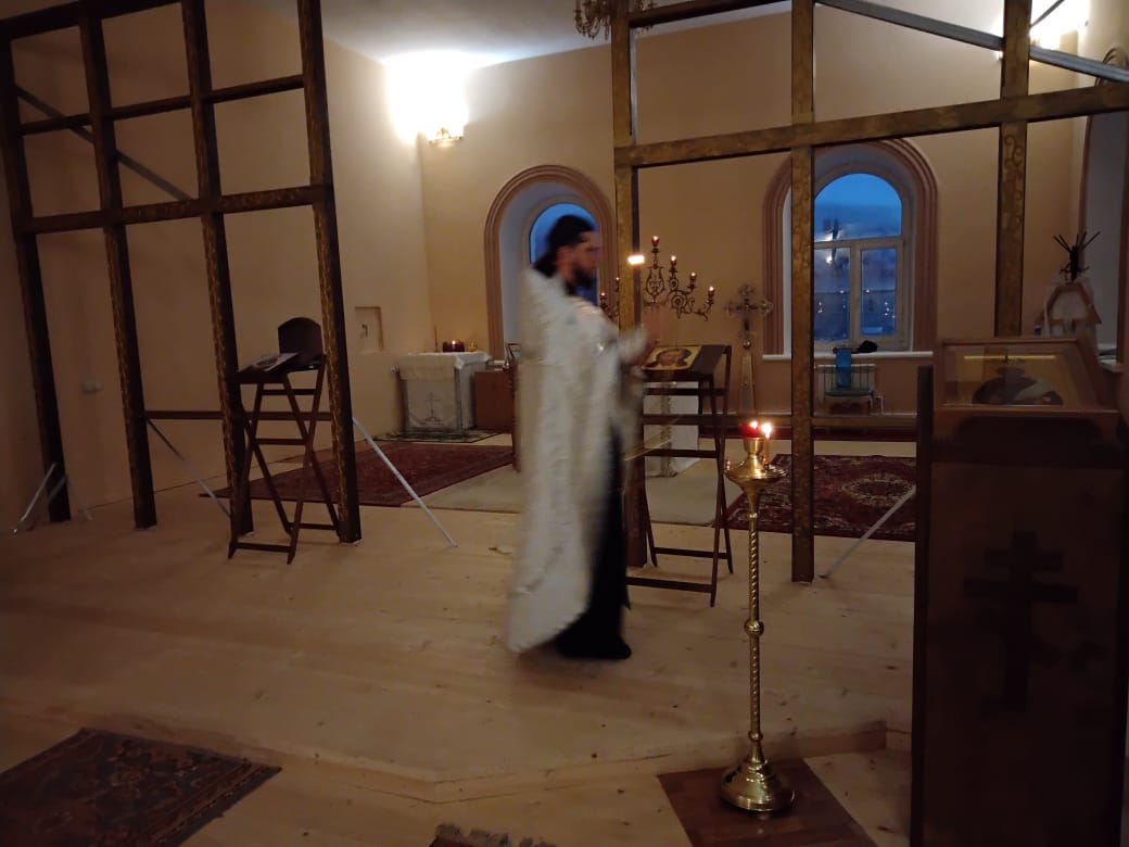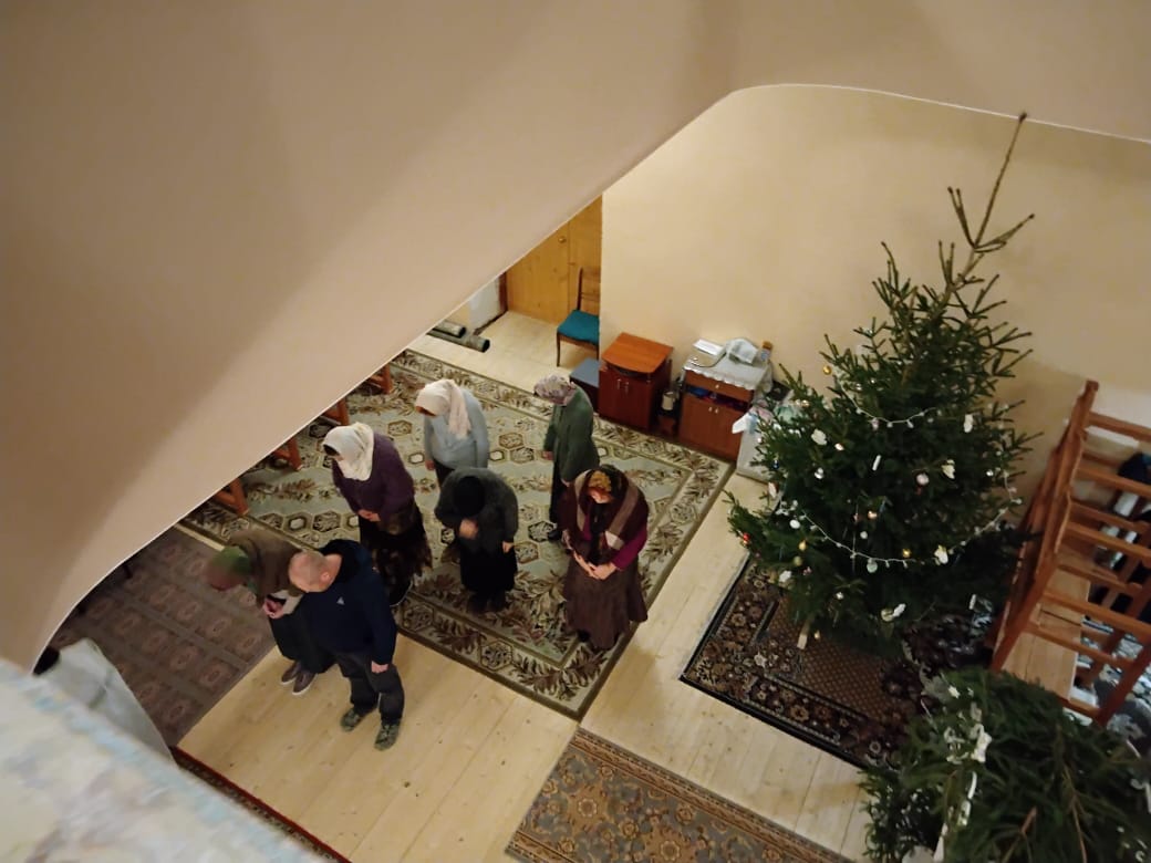 Написова́шеся иногда́ со ста́рцем Ио́сифом,/ я́ко от се́мене Дави́дова, в Вифлее́ме Мариа́м,/ чревонося́щи безсе́менное Рожде́ние./ Наста́ же вре́мя рождества́,/ и ме́сто ни еди́ноже бе обита́лищу,/ но, я́коже кра́сная пала́та,/ верте́п Цари́це показа́шеся.// Христо́с ражда́ется пре́жде па́дший воскреси́ти о́браз.